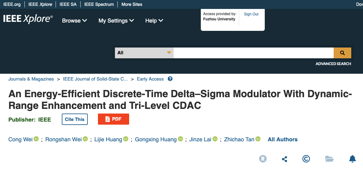 魏榕山教授课题组在集成电路领域国际顶级期刊《IEEE固态电路学报》(IEEE Journal of Solid-State Circuits,简称JSSC)在线发表了题为“An Energy-Efficient Discrete-Time Delta-Sigma Modulator With Dynamic-Range Enhancement and Tri-Level CDAC”的研究论文,福州大学博士研究生魏聪为该篇论文的第一作者,魏榕山教授为唯一通讯作者,福州大学为第一署名单位和唯一通讯单位。据了解,这是我省高校、科研机构首次以第一/通讯单位在JSSC发表重要成果。